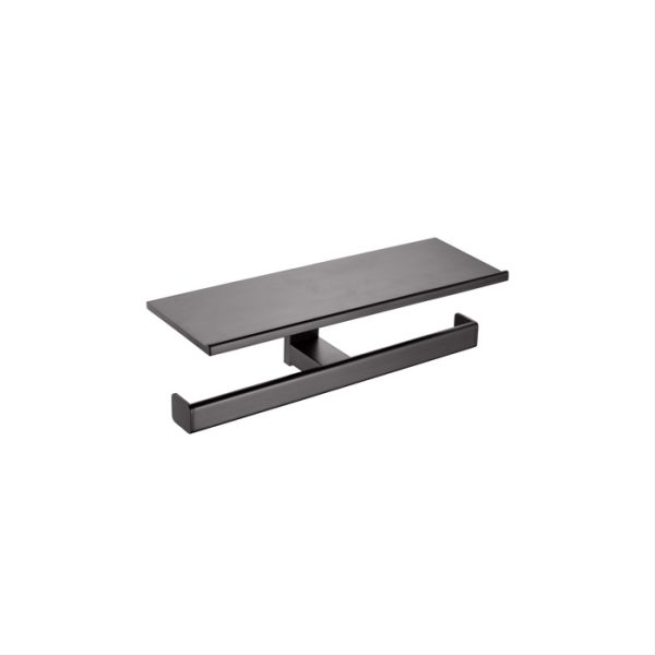 Wall mounted double toilet roll holder with shelf.